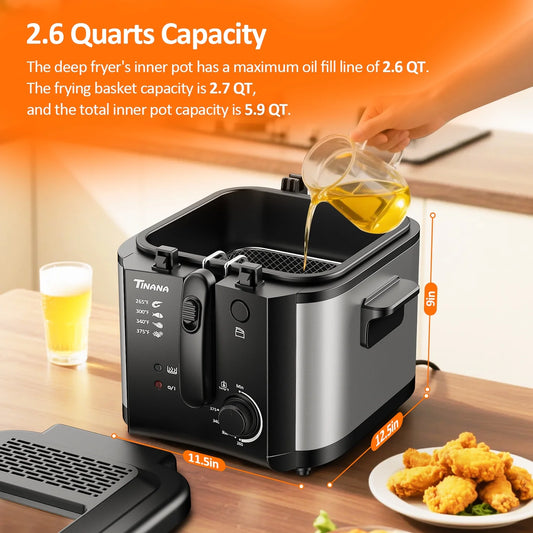 Electric Deep Fryer with Basket and Lid, 5.9 Qt Enamel Fry Pot, 2.6 Qt Oil Capacity, Stainless Steel Oil Fryer for Home, Chicken & French Fries Maker, Easy Clean Deep Fat Fryer